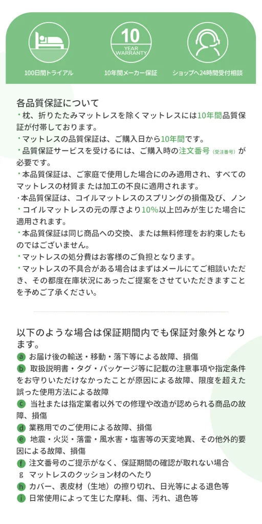 Novilla(ノウィラ)マットレスは、購入後の10年保証があり、また100日間のトライアルがあるので、